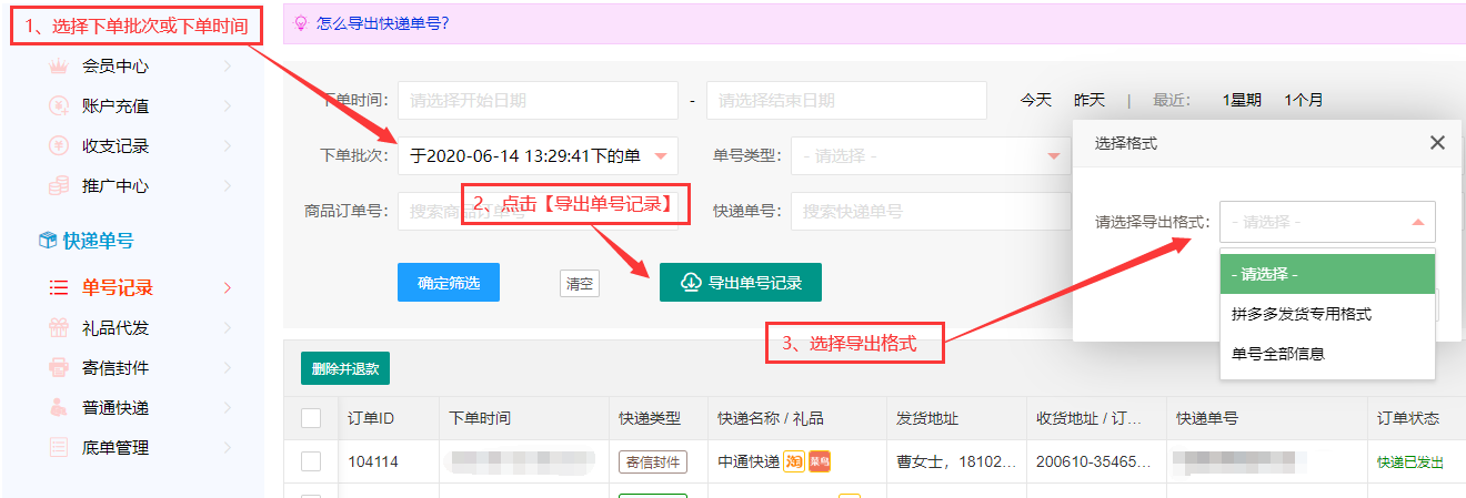 1、如果导出单号是给拼多多店铺后台发货用,请务必选择拼多多发货专用格式。